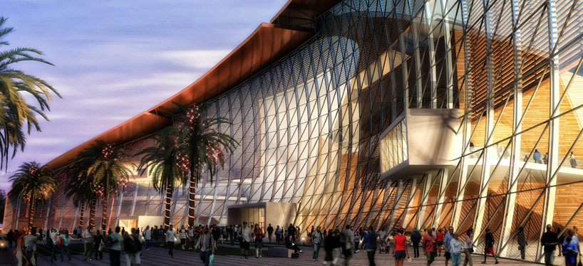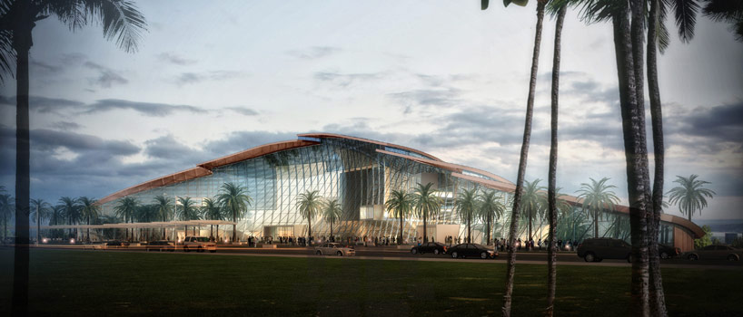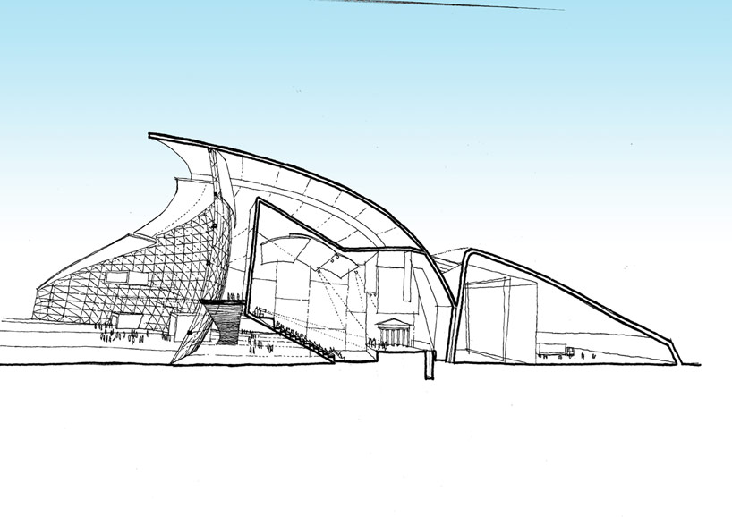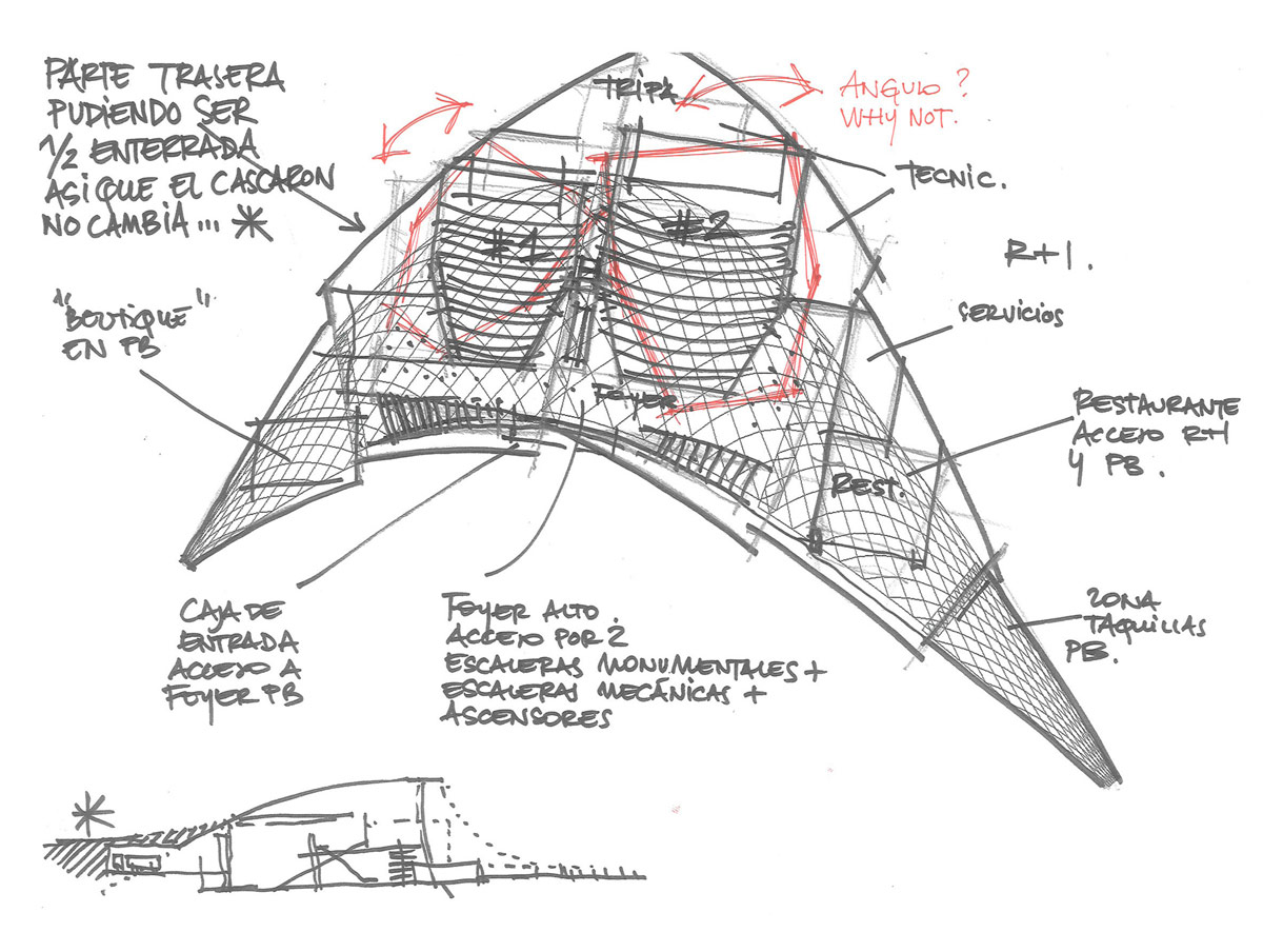 حالت محدب این ساختمان بدلیل محیط آن است و در پی ترسیم ماهیت دوگانه این پروژه است. ورودی اصلی (عمومی) در قسمت مقعر در نظر گرفته شده است. در محیط آن نیز طراحی منظر مناسبی برای کشاندن عموم به سالن انجام شده است.