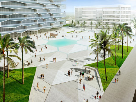 گروه معماری BIG از طرح خود برای بلوک آپارتمانی در باهاماس با ویژگی نمای لانه زنبوری و استخر اختصاصی هر واحد در بالکنهای آن رونمایی کرد. BIG، گروهی که توسط معماری دانمارکی به نام بیارکه انگلس رهبری میشود، این ساختمان مسکونی 8 طبقه را برای سایتی در جنوب ساحل جزیره نیوپراویننس، جایی که قرار است به بلندترین ساختار جامعه آلبانی تبدیل شود، طراحی میکند. نمای لانه زنبوری فقط قسمت جنوبی ساختمان را پوشش میدهد. بالکنهای به شکل 6 ضلعی بوده و طوری طراحی شدهاند که آب در ته آنها جمع میشود و با دیوارهی کناری شیشهای محیطی بسته برای نگهداشتن آب استخر بوجود آوردهاند. این ساختمان به کمک دو گروه دیگر انجام خواهد پذیرفت و سه ساختمان دیگر نیز کنار آن ساخته خواهد شد.