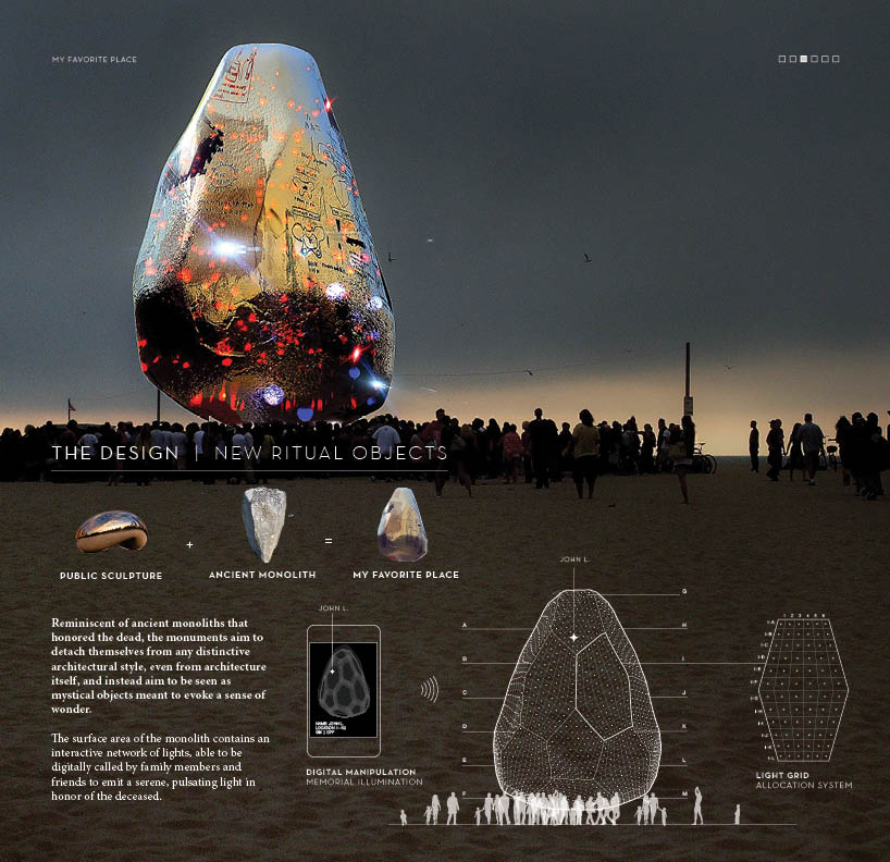 این پروپوزال برای مسابقه بینالمللی وبسایت Designboom با موضوع "Design for Death" ارائه شده. در این طرح، فرم تخم مرغ مانند عظیمی به صورت مستقیم و بیواسطه در یک مکان عمومی قرار میگیرد. فرم طلایی رنگ آن به خوبی از محیط اطراف قابل تشخیص است، به طوری که میتواند نقش بنای یادبود برای از دست رفتگان ما و حتی خود ما را در یک مکان عمومی ایفا کند! شاید میتوان این ادعا را داشت که سعی در تغییر آیین و مراسمات ترحیم داشته و بجای آنها یک پلتفرم آزاد تعریف میکند که فرهنگهای مختلف میتوانند با هم وفق پیدا کنند و در گذر زمان با هم ادغام شوند.